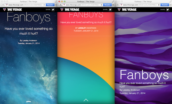 Adaptive editorial design iOS http://www.theverge.com/2014/1/21/5307992/inside-the-mind-of-a-fanboy?ios … Android http://www.theverge.com/2014/1/21/5307992/inside-the-mind-of-a-fanboy?android … Windows http://www.theverge.com/2014/1/21/5307992/inside-the-mind-of-a-fanboy?windows …pic.twitter.com/lh8YOMoFiw