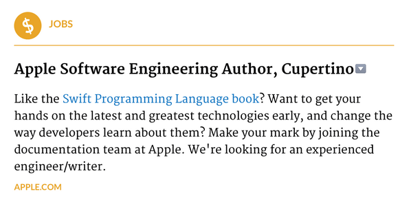 Nice, the Apple documentation team advertises its open positions in Dave’s @iOSDevWeekly http://iosdevweekly.com/ pic.twitter.com/NoDT4mnNAf