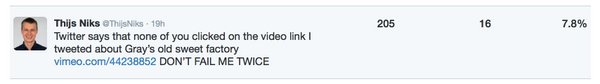 Twitter says that none of you clicked on the video link I tweeted about Gray’s old sweet factory http://vimeo.com/44238852 DON’T FAIL ME TWICE