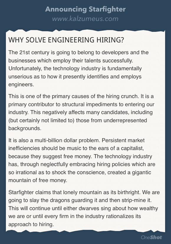 Software Engineering Hiring https://www.kalzumeus.com/2015/03/09/announcing-starfighter/ …pic.twitter.com/3CJYm1ZDeU