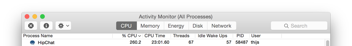 Not sure why, but HipChat now takes up multiple cores after waking from sleep. I guess chatting is hard work.pic.twitter.com/dqwgGqoV9Z