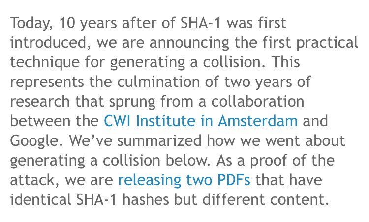 From the people who brought us Python: The first practical SHA-1 collision https://security.googleblog.com/2017/02/announcing-first-sha1-collision.html …pic.twitter.com/lGvlKvqLdo
