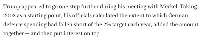 Trump handed Merkel a bill — thought to be for more than £300bn — for money her country “owed” Nato last weekend http://www.thetimes.co.uk/article/germany-dismisses-white-houses-intimidating-300bn-bill-for-defence-dl7dk629k … pic.twitter.com/q7g4Afs8Ef