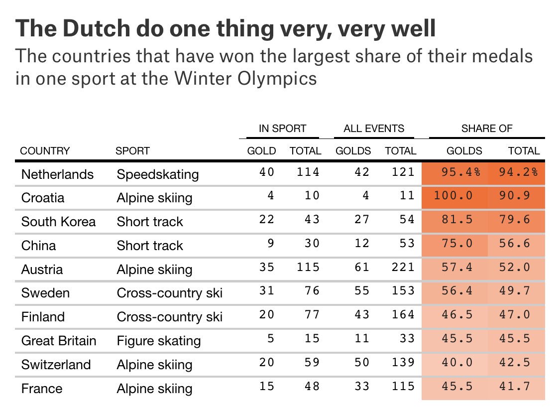 Since the 1998 Games, the Netherlands has captured 37% of all speedskating podium spots https://fivethirtyeight.com/features/the-dutch-own-a-single-sport-like-no-other-country-in-the-winter-olympics/ …pic.twitter.com/yb2nPPQ9ur