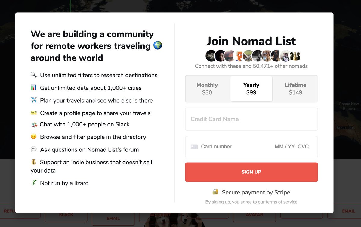 💳 Working on this checkout modal for @nomadlist, the idea is to get ppl to convert fast: 1) Use a feature, 2) See it's paid-only 3) Show this modal 4) Pay 5) Unlock features on page Kinda like in-app purchases Layout = carbon copy of @marckohlbrugge's @wipchat checkout 😍pic.twitter.com/pWM1BfQpAU