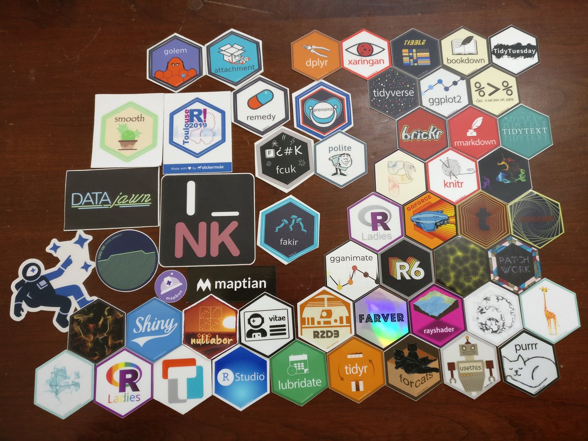 #rstats hex anymore. Ready for#fosdem2020 ! Didn't had to go to#rstudioconf2020 though... My collection was enough.#onthetrainagainpic.twitter.com/tmvdW0MbbH
