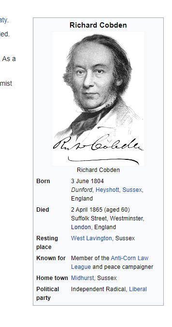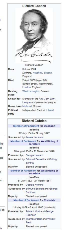 The original infobox gave the impression that Cobden was from and of Sussex and London. The text celebrated his work in Manchester. But his political career representing Stockport, Rochdale, and West Yorkshire was largely missing. So I added that. And now people will know more.pic.twitter.com/hv7pfXR8Dw