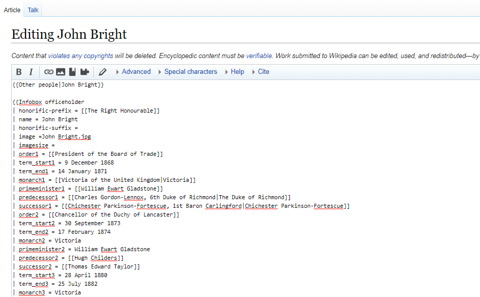 So I click on the "Edit source" button for John Bright. And start copying and pasting the MP section over to the equivalent for Richard Cobden. We're lucky that the West Riding of Yorkshire (UK Parliamentary constituency) page is up to date. https://en.wikipedia.org/wiki/West_Riding_of_Yorkshire_(UK_Parliament_constituency) …pic.twitter.com/mnaXgbySc6