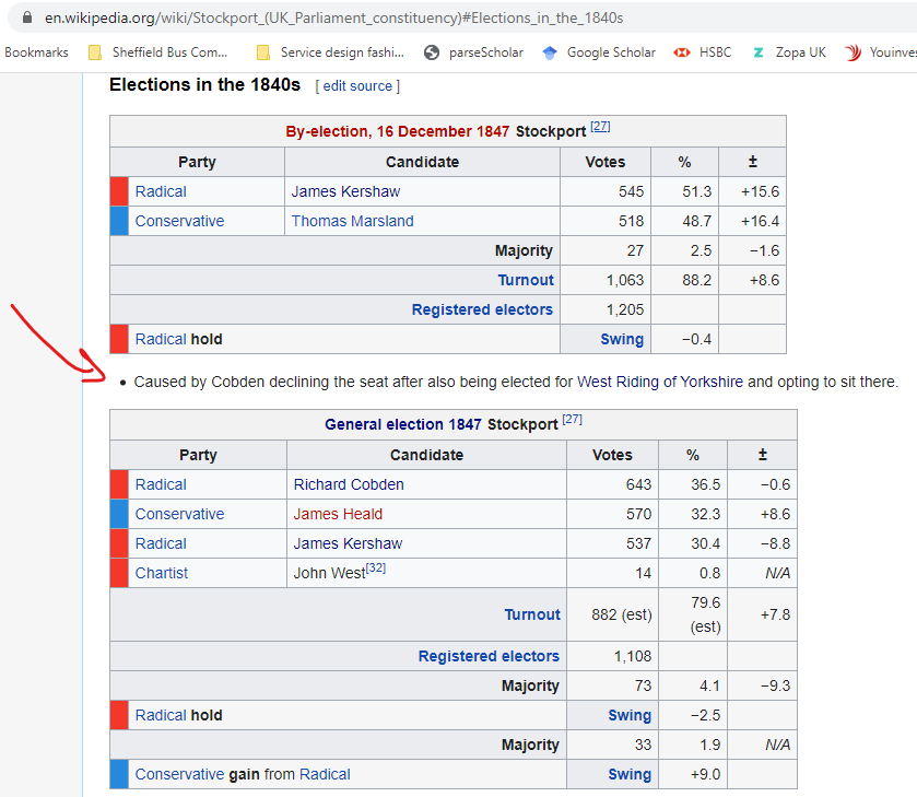 And there we go. Now for the challenging part of Wikipedia. Someone else may now come along and decide that my edit was bad and undo it. That's life. I've learned (but not confident enough to put it on Wikipedia) that Cobden stood in two seats at once. https://en.wikipedia.org/wiki/Richard_Cobden …pic.twitter.com/LZJeHigxPH