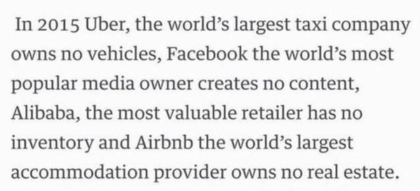 Uber: no cars Facebook: creates no content Airbnb: no real-estate