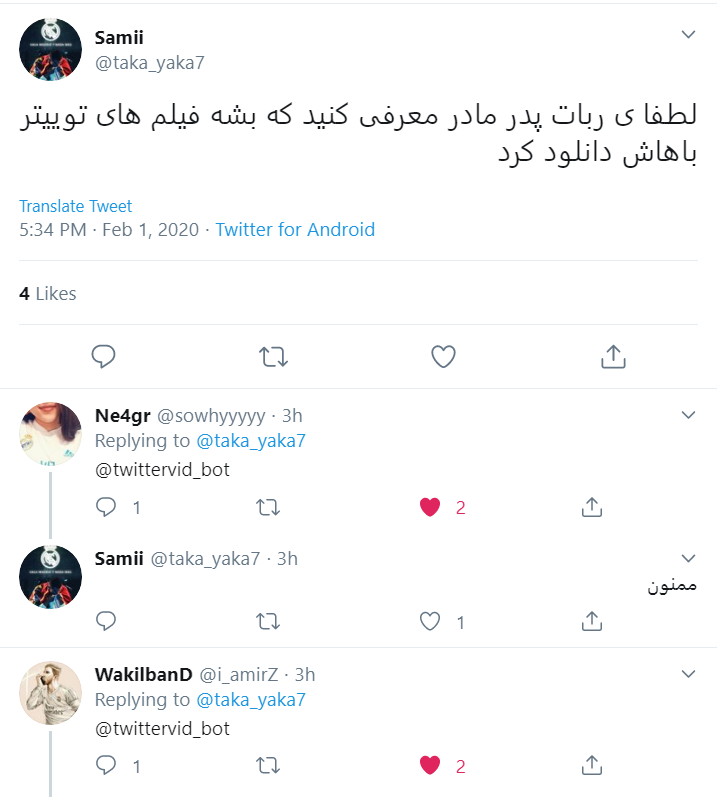 بالاخره از حالا میتونین با رباتم رشته توییت ها رو بطور کامل در تلگرام بخونید. فقط کافیه لینک توییت رو برای ربات بفرستید، اگر اون توییت جزوی از رشته توییت بود، ربات بهتون اطلاع میده و با زدن دکمه "دریافت" میتونید رشته توییت دریافت کنید. https://t.me/twittervid_bot?start=twitter …