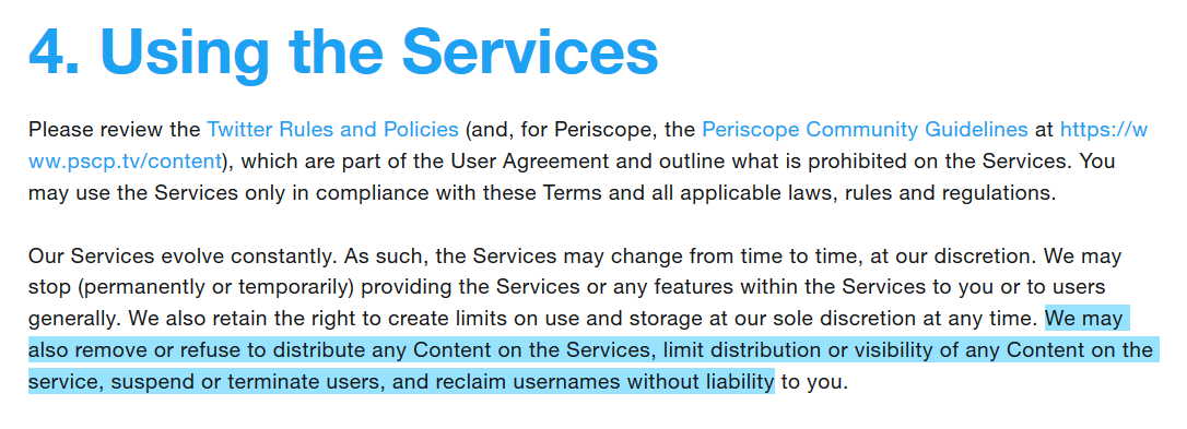 Twitter updated terms of service states that they will hide your content from everyone if they don't like it. https://twitter.com/en/tos pic.twitter.com/458tjM0Aw5