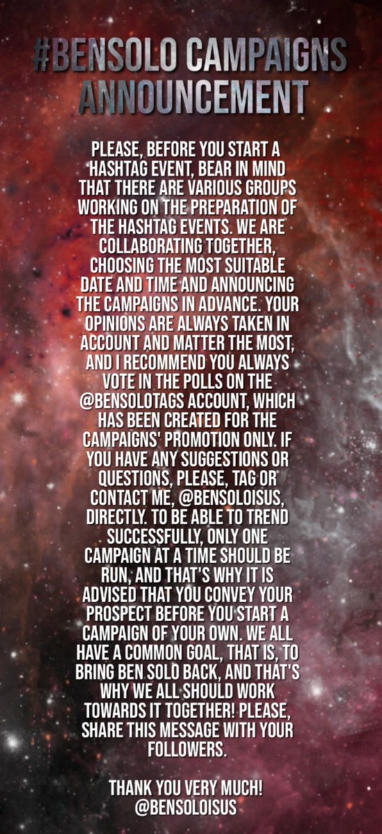 We've created an OFFICIAL GROUP of worldwide hashtag CAMPAIGNS which support Ben Solo