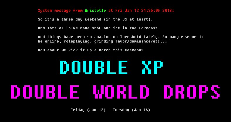 SURPRISE BONUS WEEKEND! Fri (Jan 12) -> Tue (Jan 16) ----> DOUBLE XP ----> DOUBLE WORLD DROPS http://www.thresholdrpg.com pic.twitter.com/qSTgpPmmJw