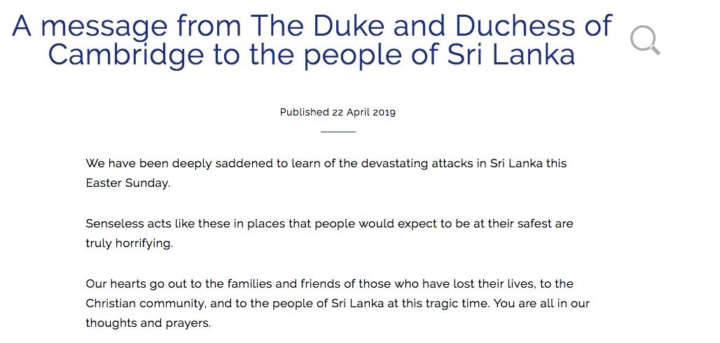 Prince William and Kate Middleton say they "have been deeply saddened" to learn of Sri Lanka's Easter Sunday terrorist attackspic.twitter.com/46rfLT7C0i