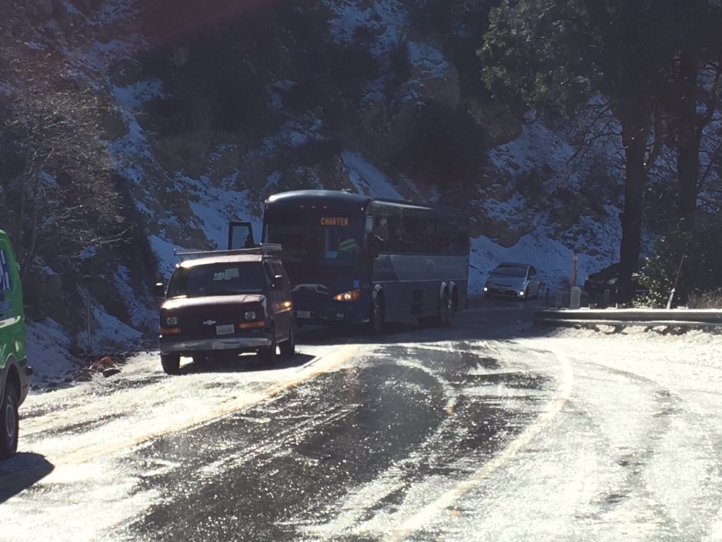 Bus blocking the downhill side of the 138. Icy conditions in Crestline.pic.twitter.com/P9bF9aIMiq
