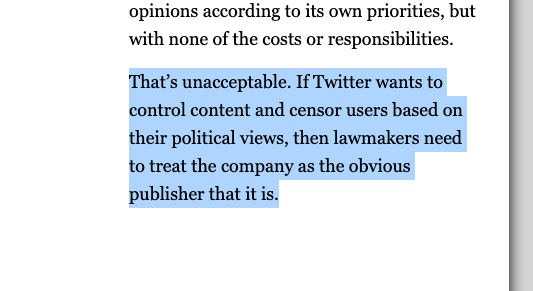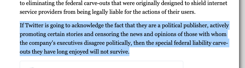 #section230 gibberish, this time via@bdomenech - Section 230 makes no distinction between "publishers" and "platforms" - The "special federal liability carve-outs" are not contingent on neutrality - Twitter as publisher = less conservative speech https://thefederalist.com/2020/02/21/twitter-just-made-ideological-defamation-its-official-corporate-policy/#.Xk__kq2IO64.twitter …pic.twitter.com/I7FQJIaKib