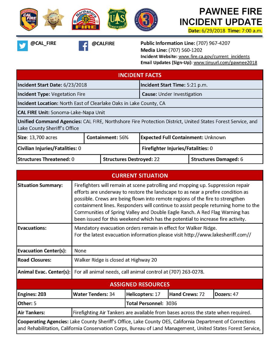 #PawneeFiren Weekend RedFlag Warn 13,700 acr 56% Mandatory#Evacuation Remain#WalkerRidge FF 3036/Eng 203/Crew72/Helo 17 YubaNet:https://yubanet.com/Fires/pawnee/ CALFire:http://www.fire.ca.gov/current_incidents/incidentdetails/Index/2080 …#NorCal#NorCalFire#CAFire#CALFire#LakeCountyCA#Colusa#lakecountyhttps://twitter.com/CAL_FIRE/status/1012708213744005120 …