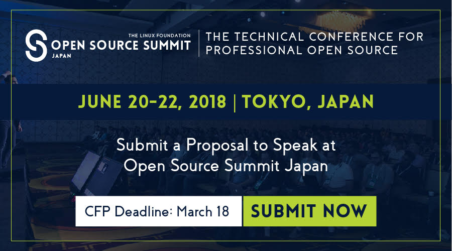 Submit your talk proposal for #OSSummit Japan today! http://bit.ly/2sG6gVb  🌏 pic.twitter.com/eZQLuAF7bS — The Linux Foundation (linuxfoundation) March 4, 2018 Submit your talk proposal for #OSSummit Japan today! http://bit.ly/2CCYNWO  🌏 http://bit.ly/2FTJIDC  #linux #op…