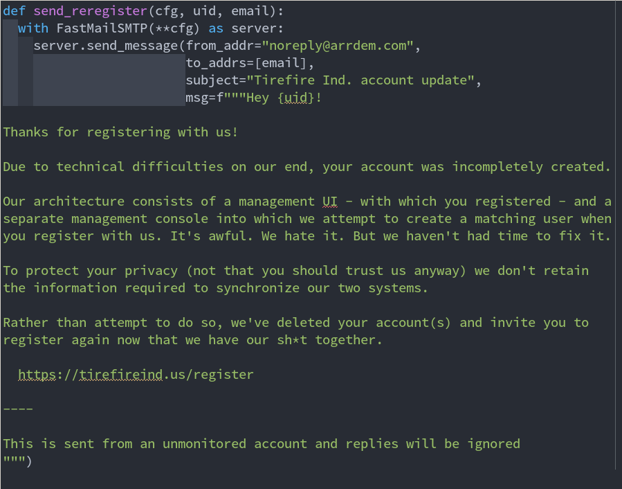 Hey folks, As you may have been aware, our registration was hosed for a while there in ways which may not have been obvious to you. We've done our best to clean up the accounts and invite you to re-register, but a few of you may have been dropped. Sorry about that :/pic.twitter.com/mR5k6CrUHV