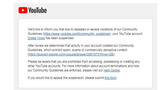 bhai same message mere ko bhi kya . #digitalvinod channel tha mera koi warning bhi nhi aie @YouTubeIndiapic.twitter.com/mbQdHwd9Ic