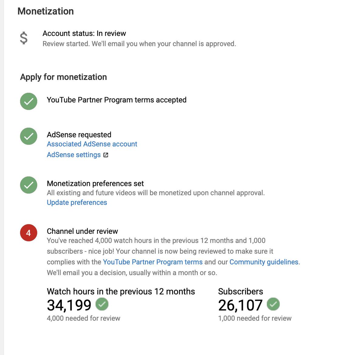.@YTCreators Can my channel finish being under review? Been waiting quite a bit. Well over the 1000 subscriber minimum, wellllll over the 4000 watch hour minimum. pls thx.