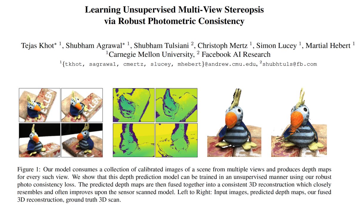 New preprint released! Learning Unsupervised Multi-View Stereopsis via Robust Photometric Consistency (http://arxiv.org/abs/1905.02706 ) We present a novel objective formulation that enables robust self-supervised learning for 3D reconstruction.