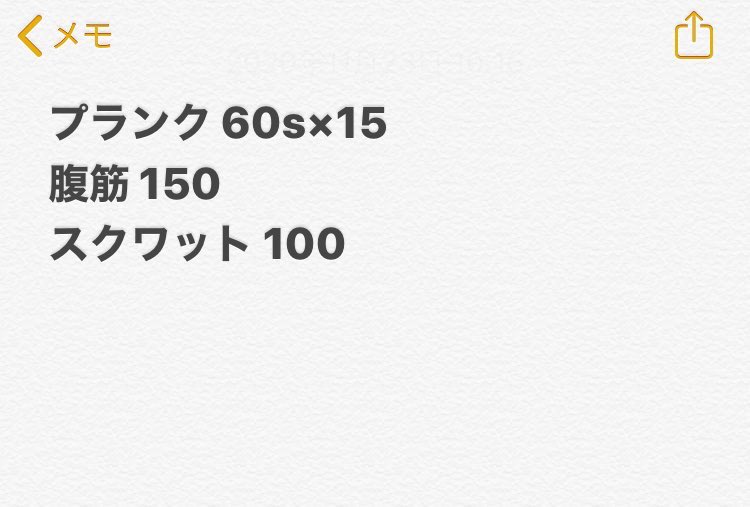 プランク2分×8セット スクワット15×5セット 腕立て(3-7秒静止) 腹筋10回×8セット