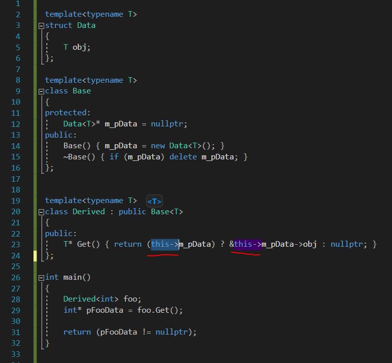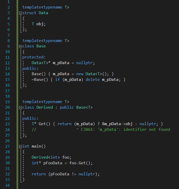 After a bit of futsing and just trying random things, I discovered that protected members have to be accessed by 'this->'. Highlighted the code for the difference. PSA to all you upgrading to latest VS, I guess.pic.twitter.com/DWiuzZsZJ2