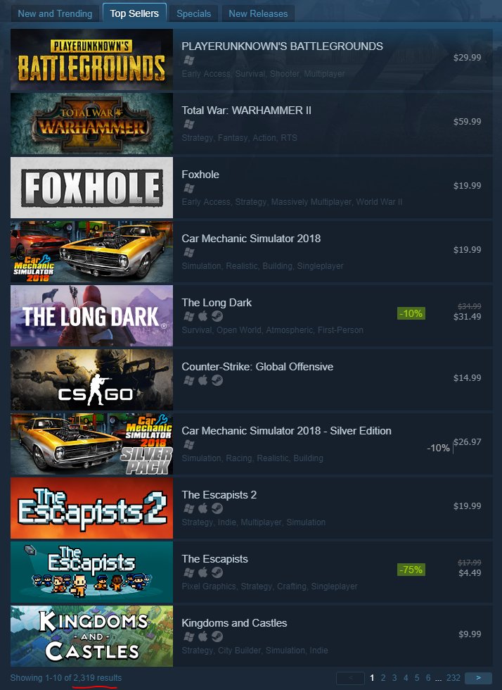 Category abuse is part of the problem. Go to Strategy games and PUBG is there. Good game, but not a strategy game. It just pushes games