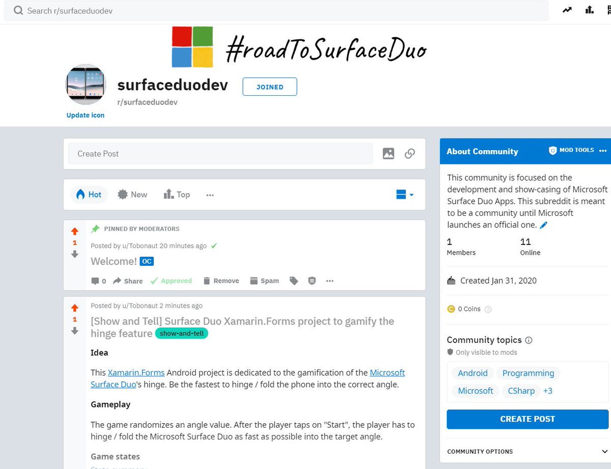 @msdev launches their official#surfaceduo developer community, I created a subreddit to connect with other devs, designers and enthusiasts. https://www.reddit.com/r/surfaceduodev/ …@gmerin@JamesMontemagno@davidortinau please ping me if this violates any rules. Thanks!#communityrockspic.twitter.com/7g0x4UYKJ5