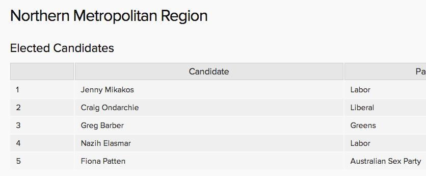 @Fiona_Patten of the Sex Party getting a seat in North Metro. Good.#vicvotespic.twitter.com/M2HUYjI40Y
