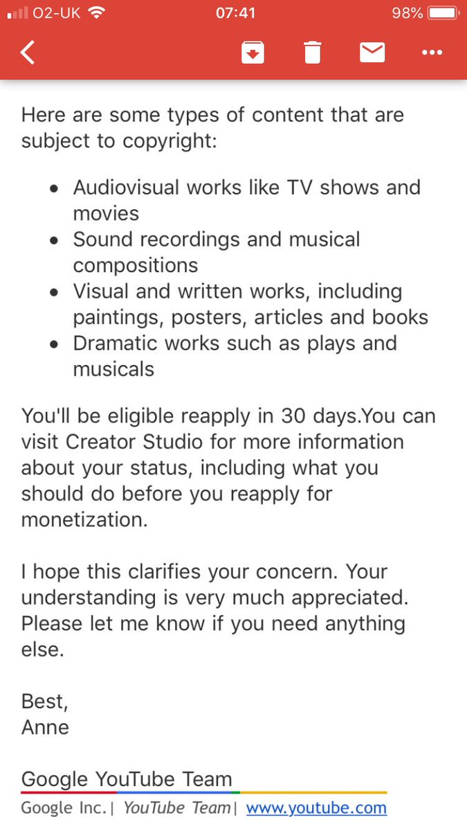 Morning. Yup and woke up to a completely unhelpful email that just reiterated what I already know. Doesn’t explain how channel was reviewed, and approved, less than 3 months ago. Are ANY vids with Content ID now reason to demonetise a whole channel?pic.twitter.com/yw9x6XXtAC