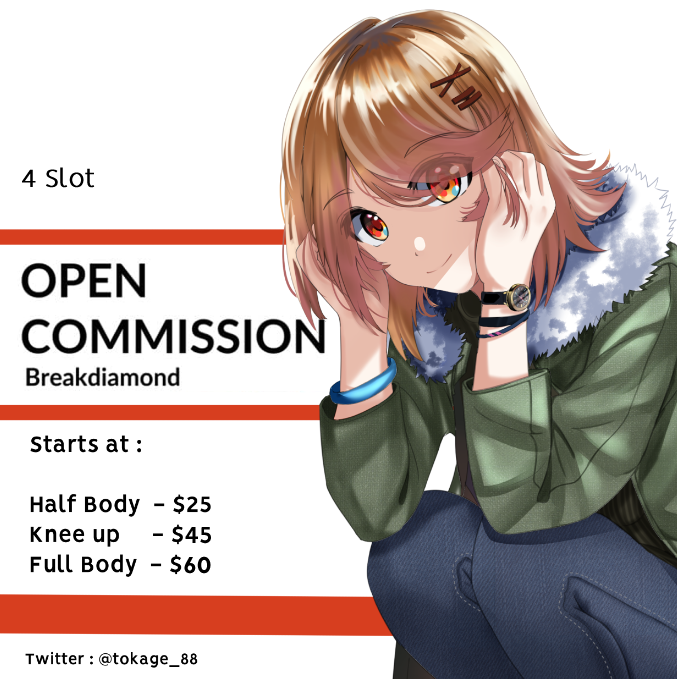Commission Open! Open for 4 slots! 2/4 slots booked starts from : 25$ (half body) 45$ (knee up) 60$ (full body) Pls help retweet and like! thank you :) DM for more info ;)