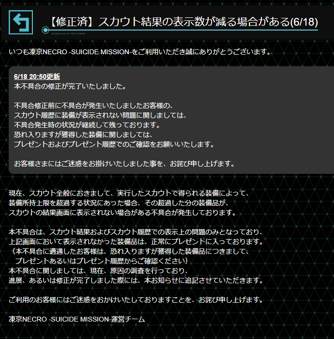 【運営からのお知らせ】 スカウトで獲得した装備が、結果画面に正しく表示されない場合がある不具合の修正が完了いたしました。 お客様にはご不便をおかけし申し訳ございません。 詳細はゲーム内お知らせ、または添付画像よりご確認ください。 http://necrosm.com