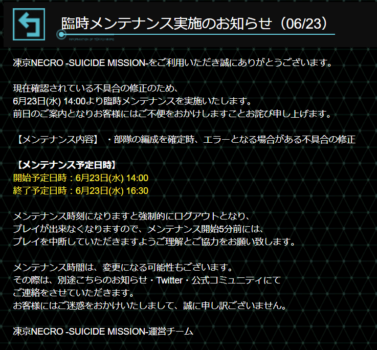 【運営からのお知らせ】 現在確認されている不具合の修正のため、下記日時に臨時メンテナンスを実施いたします。