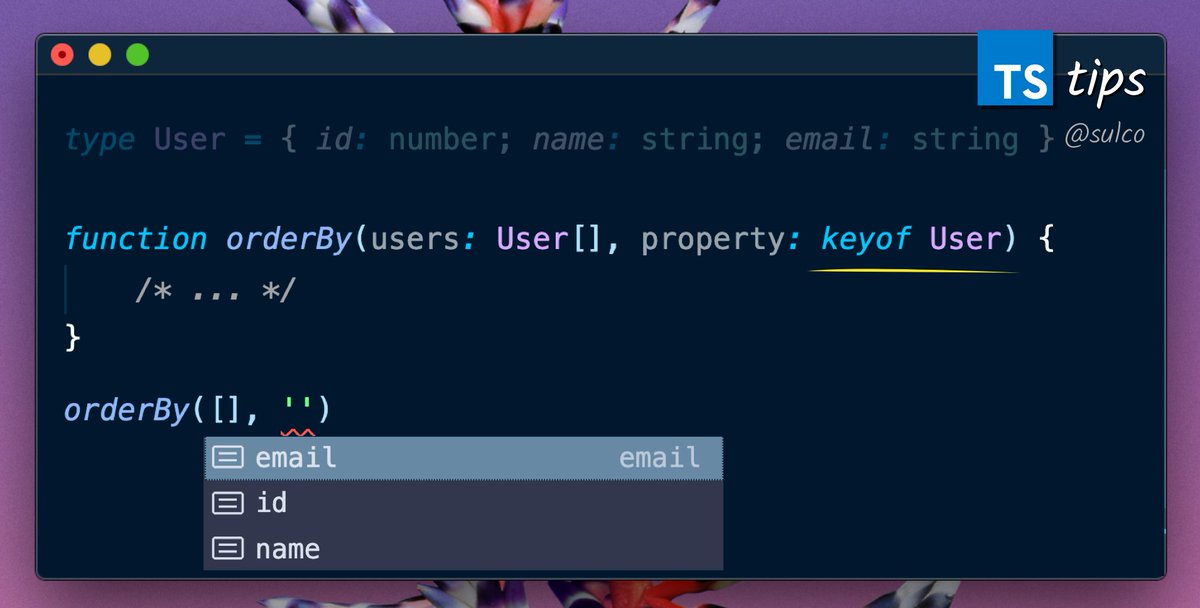 #TypeScript tip for today: `keyof` gets a union type of all properties of the given object – useful for defining params for sorting, filtering, etc.pic.twitter.com/nqlWC5POhx