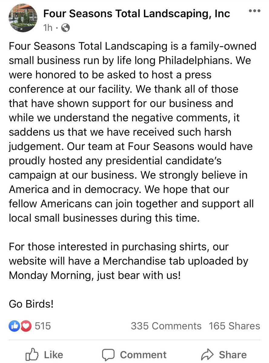 Good to see a strong bipartisan message from the owners of Four Seasons Total Landscaping. Feels like the country may be ready to turn a corner. https://www.facebook.com/168655773149863/posts/4068807186468016/?d=n …pic.twitter.com/n8lXjUlOVz