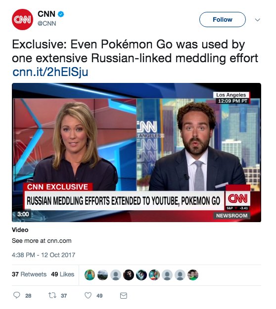 So what this whole Russia hacked the election thing has boiled down to is that Russia gave money to Facebook, Google, and pokemon go