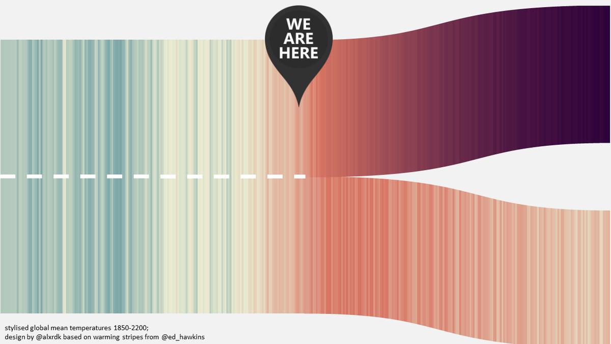 #warmingstripes by@alxrdk showing how the stripes could evolve out to 2200, depending on emission choicespic.twitter.com/notGTQ8lS8