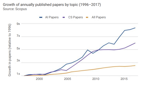 Today, roughly three times more papers get published across all scientific disciplines than in 1996. For Computer Science, this is 5x, for AI it is even 7x! (source: http://cdn.aiindex.org/2018/AI%20Index%202018%20Annual%20Report.pdf …)pic.twitter.com/Y9dpM8zCzg