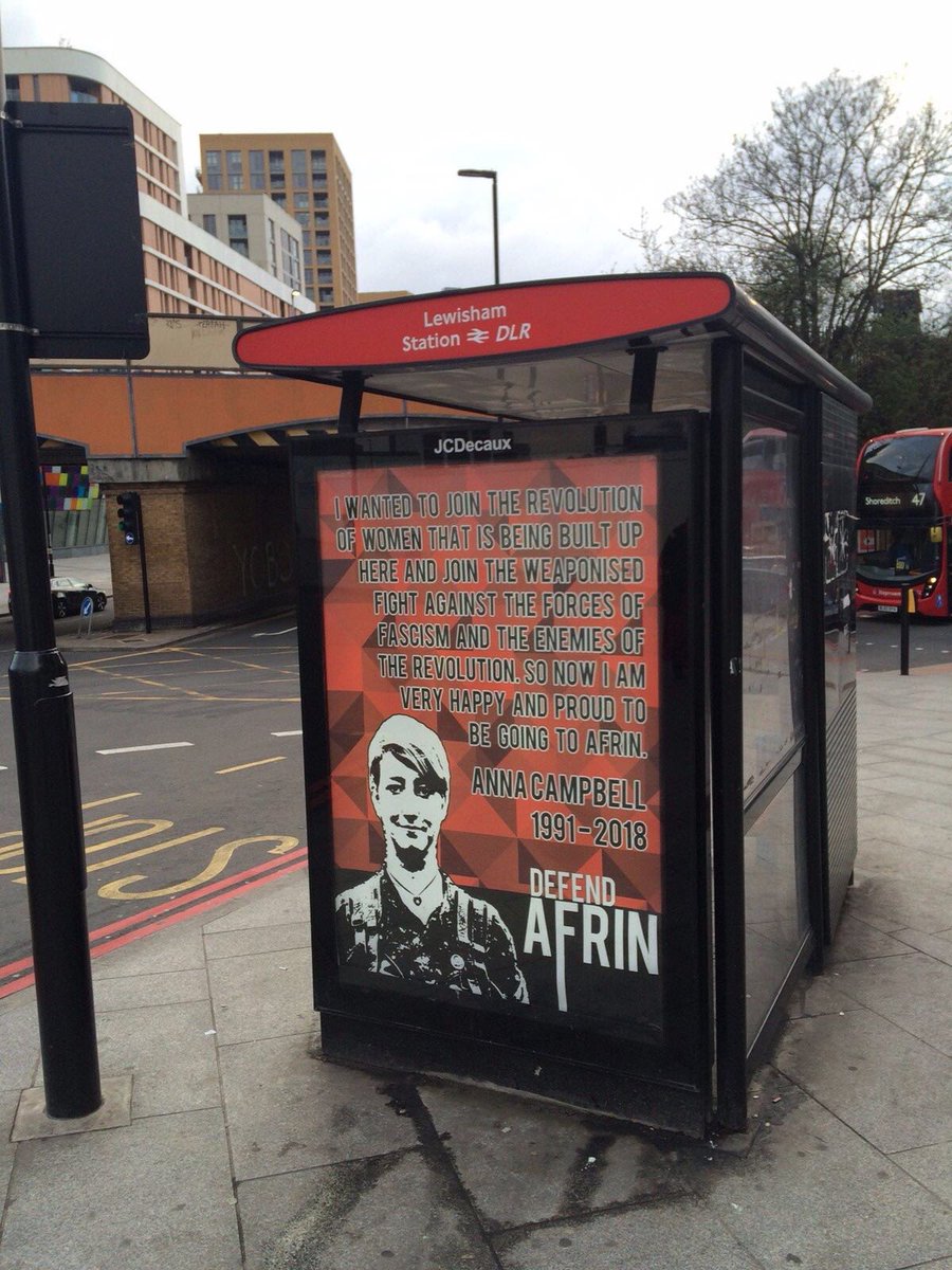 YPG posters are appearing at bus stops in south London. One honouring the late Anna Campbell, the first British female volunteer to be killed in #Rojava whilst fighting for the YPJ. pic.twitter.com/gBr55xaiP9