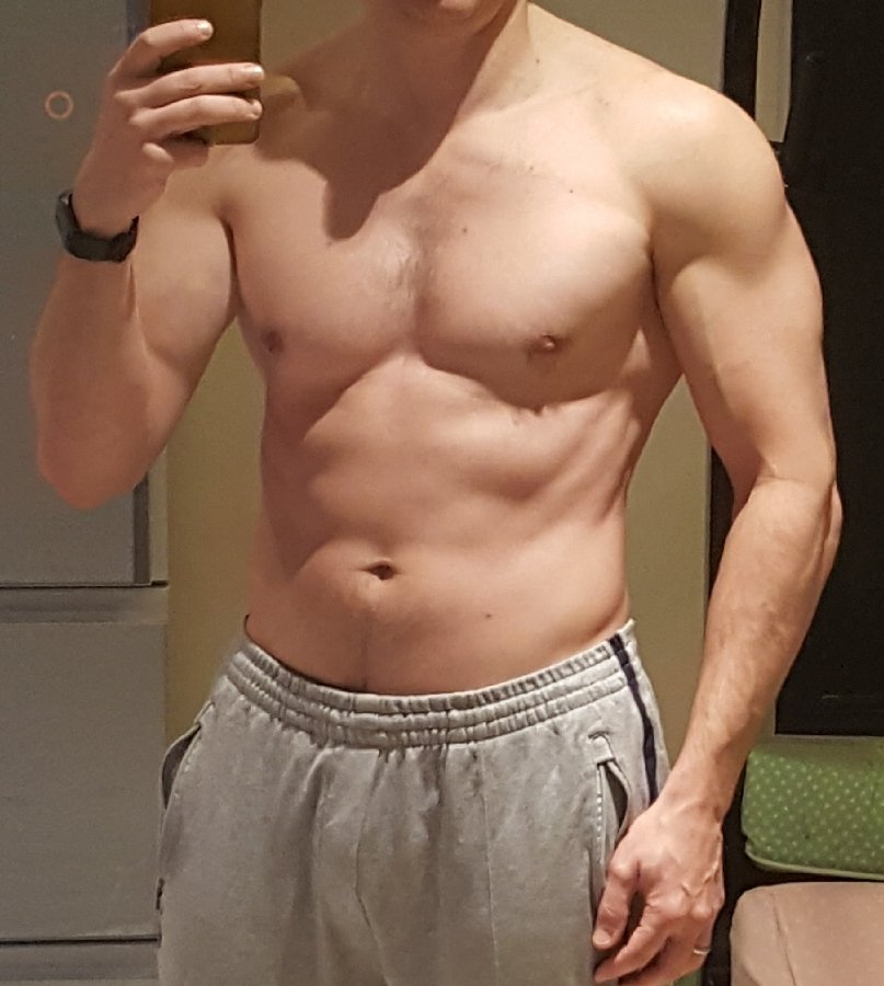 And this is how I look. I eat around 200-300g of protein a day. I just did 37-32-30 burpees. I can do 30 pull ups. 10 one-hand pushups. I think I'm healthy... for 44...