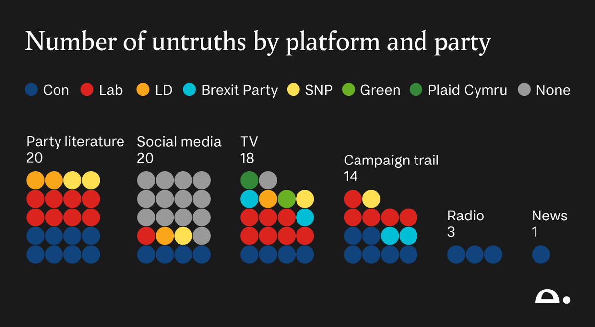 Lies, fake news, “alternative facts”. Everyone's been telling untruths this election. We checked politicians’ whoppers against analysis carried out by @FullFact + @FactCheck, and discovered that of 95 claims that were fact-checked during the campaign, 77 turned out to be untrue.