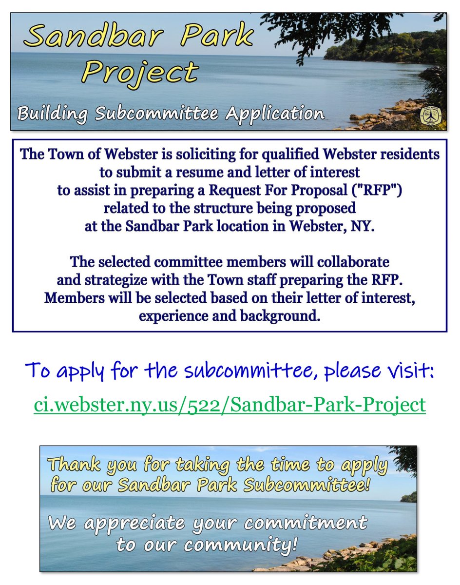 To apply for the Sandbar Subcommittee: https://www.ci.webster.ny.us/FormCenter/Boards-10/Sandbar-Subcommittee-Application-70 …pic.twitter.com/CLsEcQo5cA