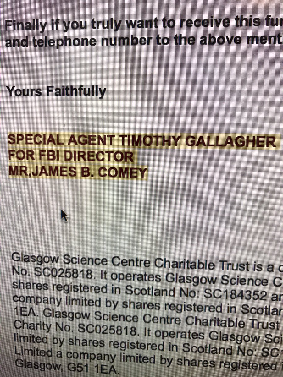 Just received this spam email signed Spec.Agent Tim G.for FBI director James Comey. I sent them all my $.