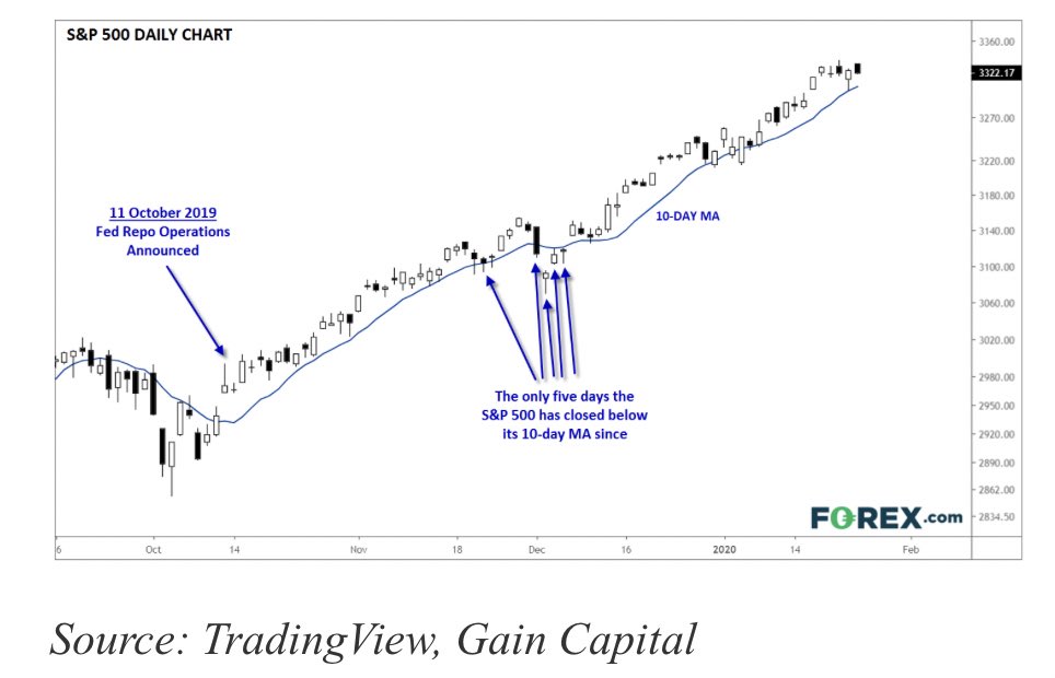 The S&P 500 has closed below its short-term 10-day moving average “just five times in the 70-plus trading days since the Fed’s repo operations began.” - Gain Capital, via