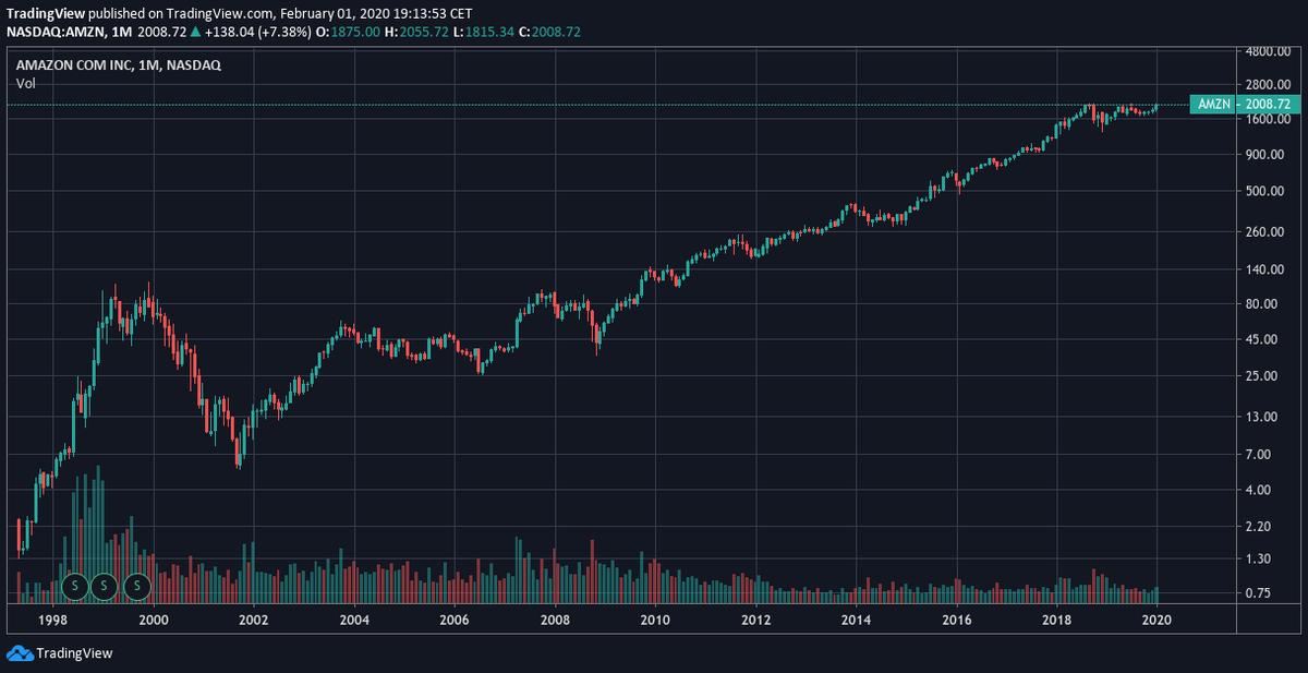 This is Amazon's rise from IPO to a market cap of $1 trillion. A log chart with splits and volume shown since 1997. Follow AMZN here: https://www.tradingview.com/symbols/NASDAQ-AMZN/ …pic.twitter.com/yqxK1DU179