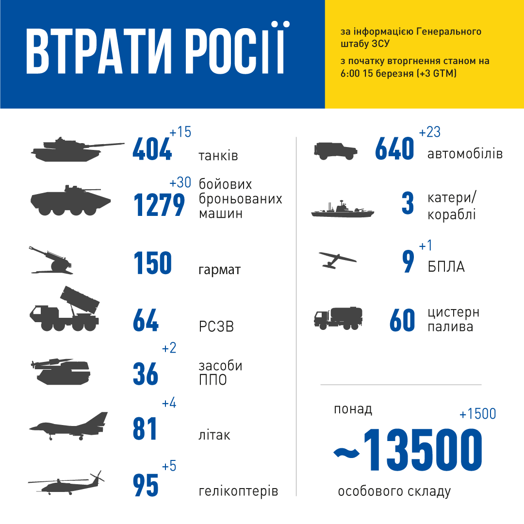Втрати ворога станом на п'ятницю, 18 березня. 23 день війни.