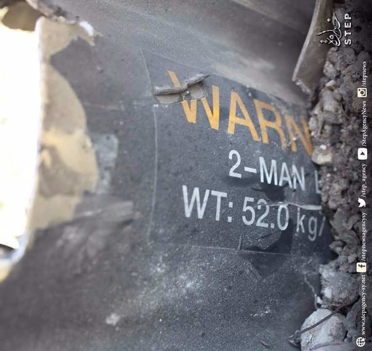 Photo of what is claimed to be a bomb remnant of the airstrike on the ‘Umar ibn Al-Khaṭṭāb mosque in Al Jīnah, #Syria. h/t @sakirkhader.pic.twitter.com/MnAnFOeh9L